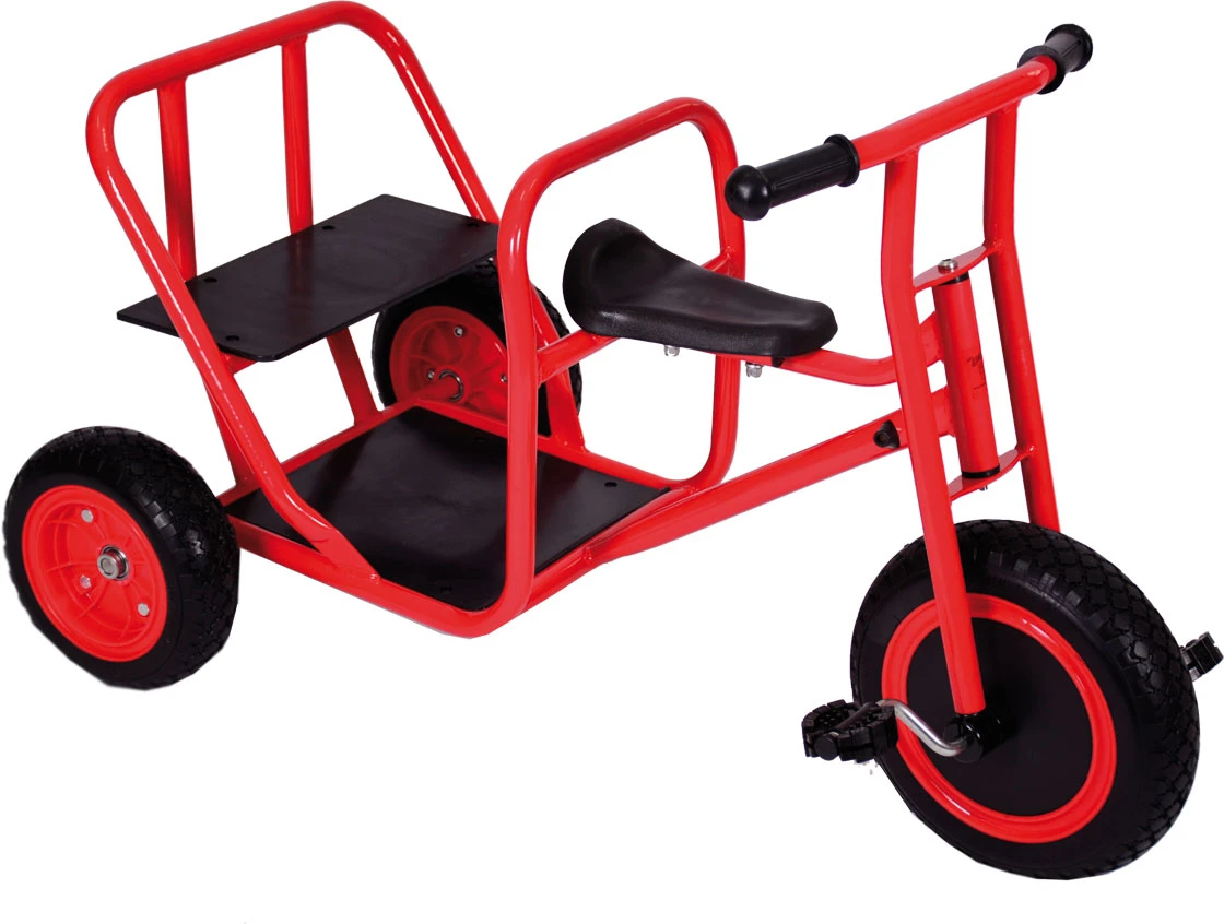 Wie wil er meerijden? 1 kind kan de taxi rijden en 1-2 kinderen kunnen plaatsnemen op het bankje en zich laten rondrijden.