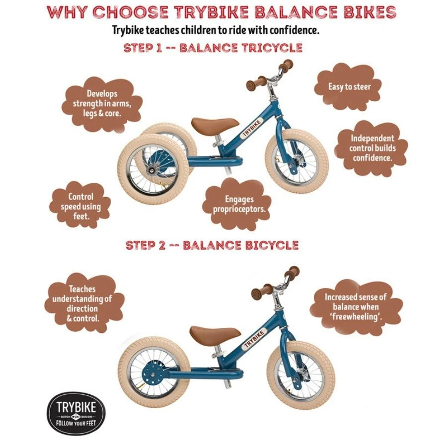 Loopfiets in vintage kleurstelling voor kinderen van  1,5 â 6 jaar. De eerste stand van de Trybike is de lage driewieler met veel stabiliteit om makkelijk loop- en rijvaardigheden te ontwikkelen. Hiermee leren kinderen al vanaf 15 maanden lopen Ên fietsen.